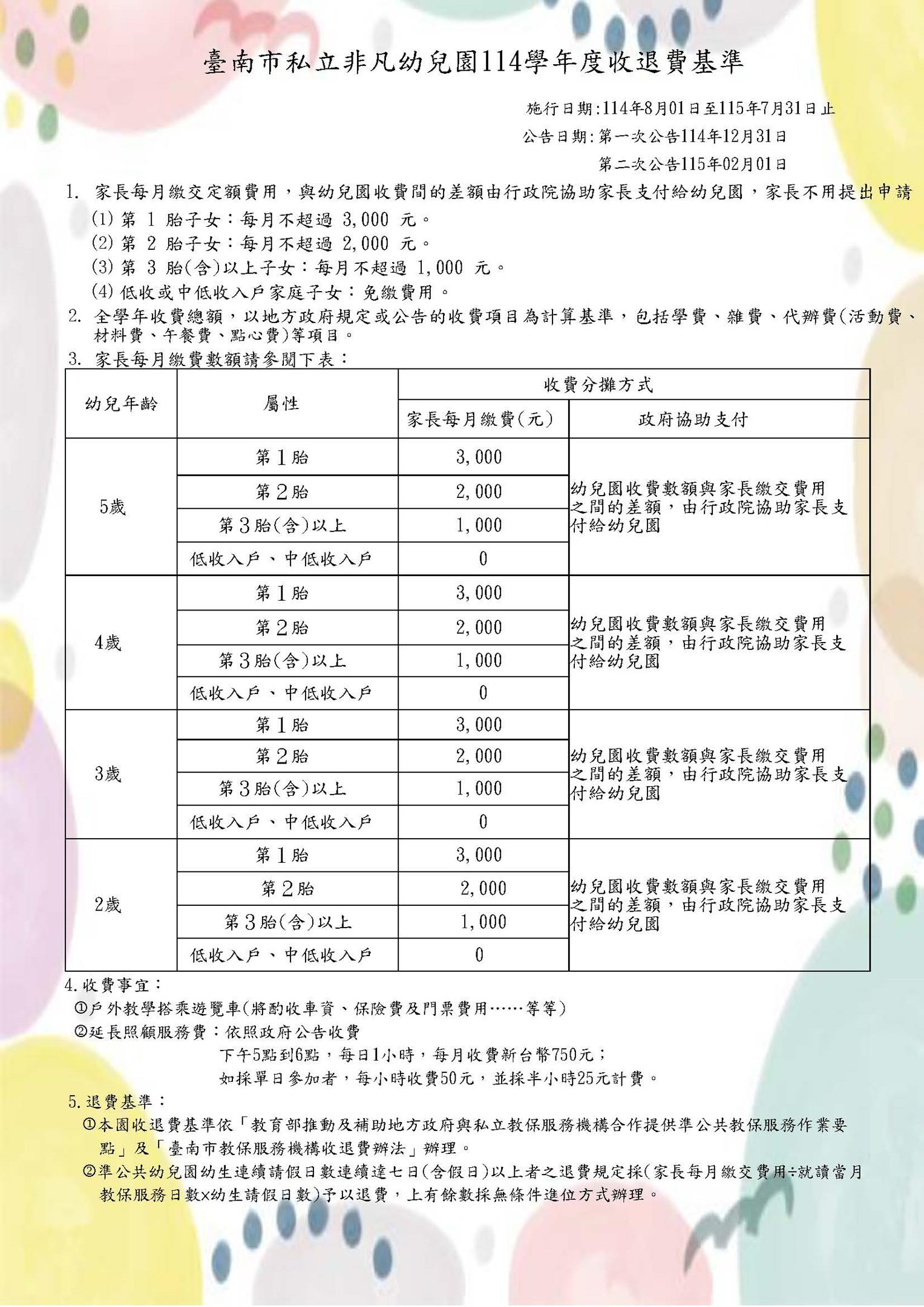 114學年度臺南市私立非凡幼兒園收退費基準-第二學期115.02.01