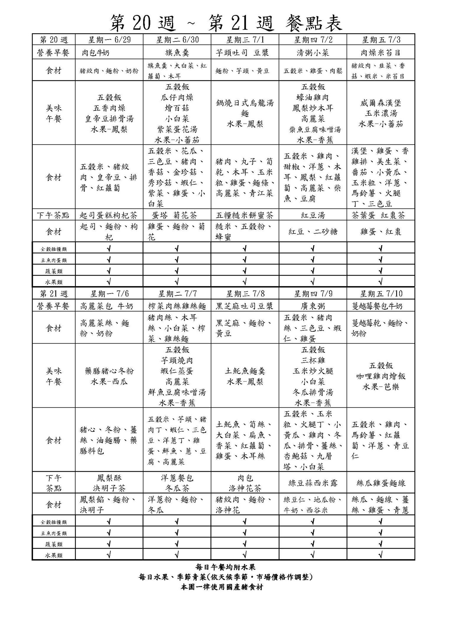 114學年度第二學期--第20週-第21週的餐點表