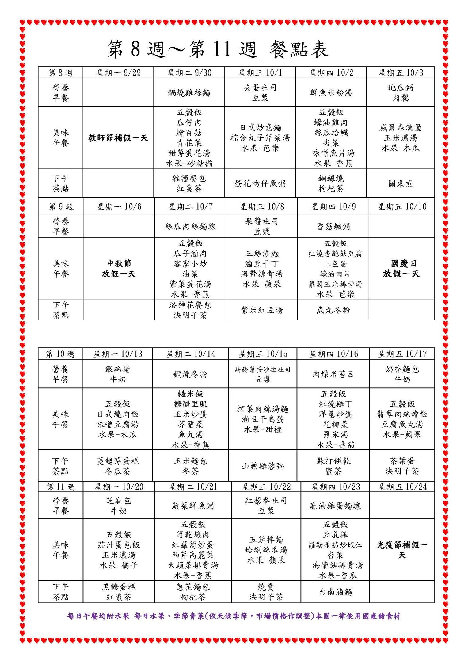 114學年度 第一學期 餐點表(第8週~第11週)