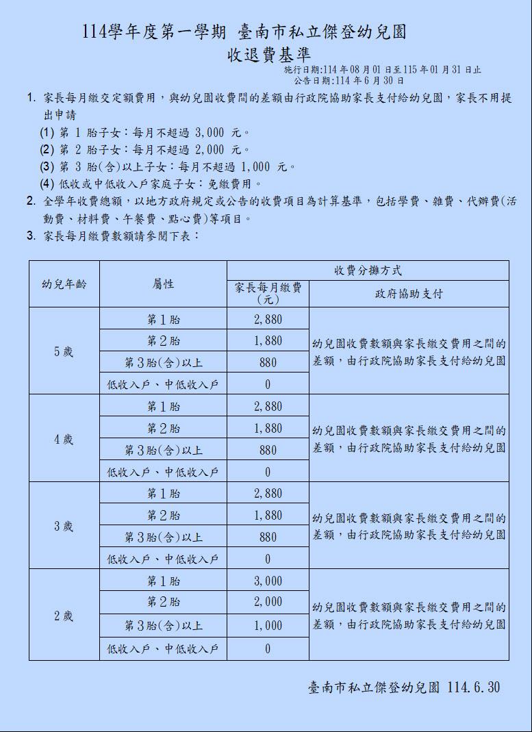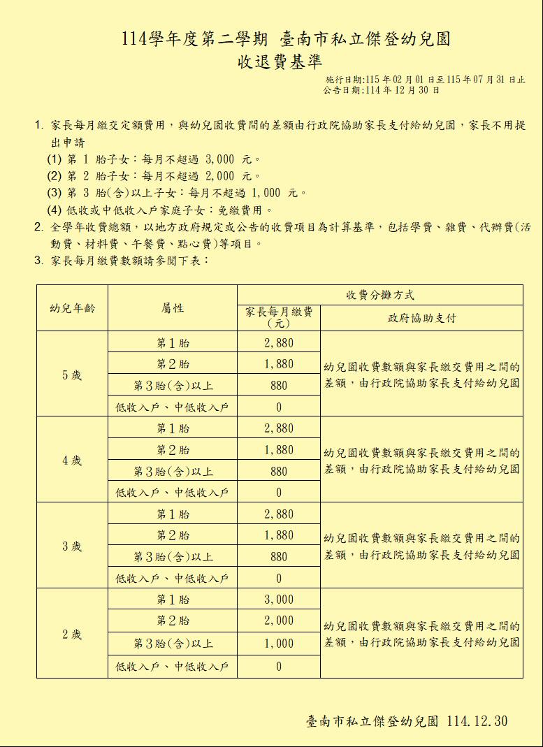 114學年度第二學期收退費基準