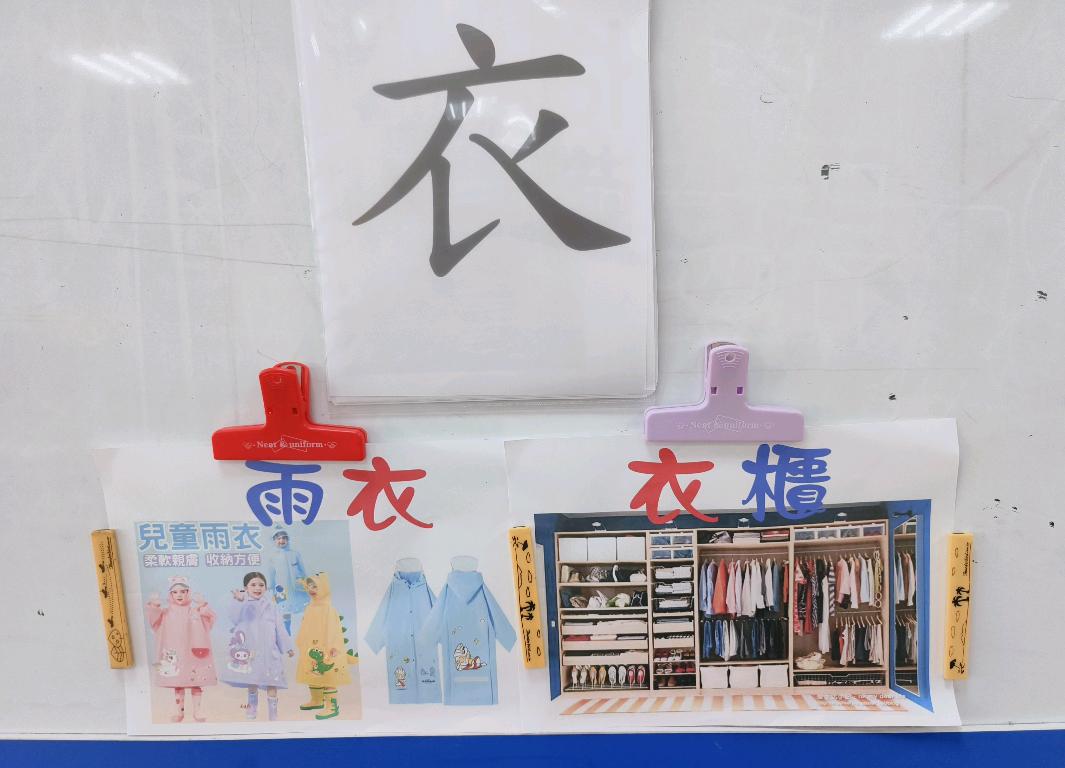 認字「衣」雨衣、衣櫃、衣架、洗衣機等語詞。