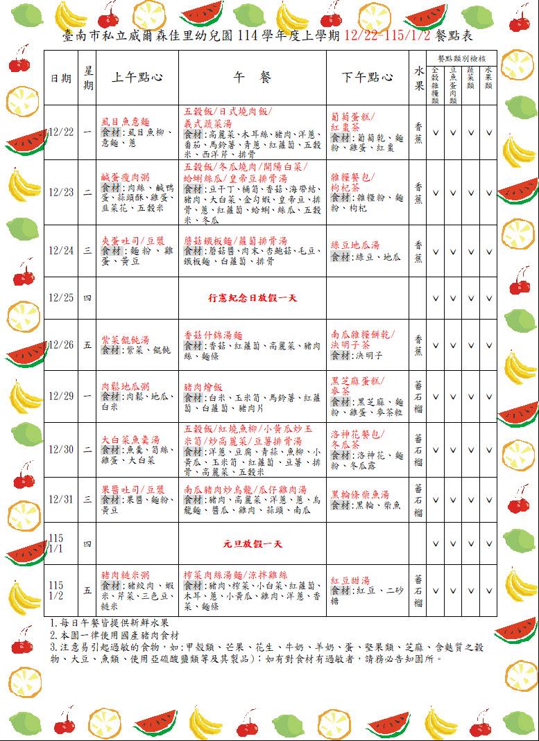 114學年上學期1208-1219餐點表 食在健康 親愛的家長你(妳)好:園所公告的餐點表為暫定預告版,如想知道當日園所菜單,可上食材登錄平台,搜尋{臺南市佳里區臺南私立威爾森佳里幼兒園},謝謝!! 2025-11-21 李怡蒨 Read more
