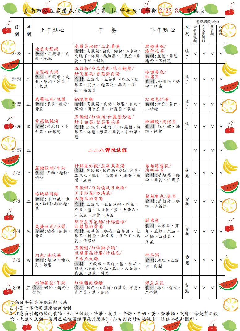 114學年下學期1150223-0306餐點表 食在健康 親愛的家長你(妳)好:園所公告的餐點表為暫定預告版,如想知道當日園所菜單,可上食材登錄平台,搜尋{臺南市佳里區臺南私立威爾森佳里幼兒園},謝謝!! 2026-01-29 李怡蒨 Read more