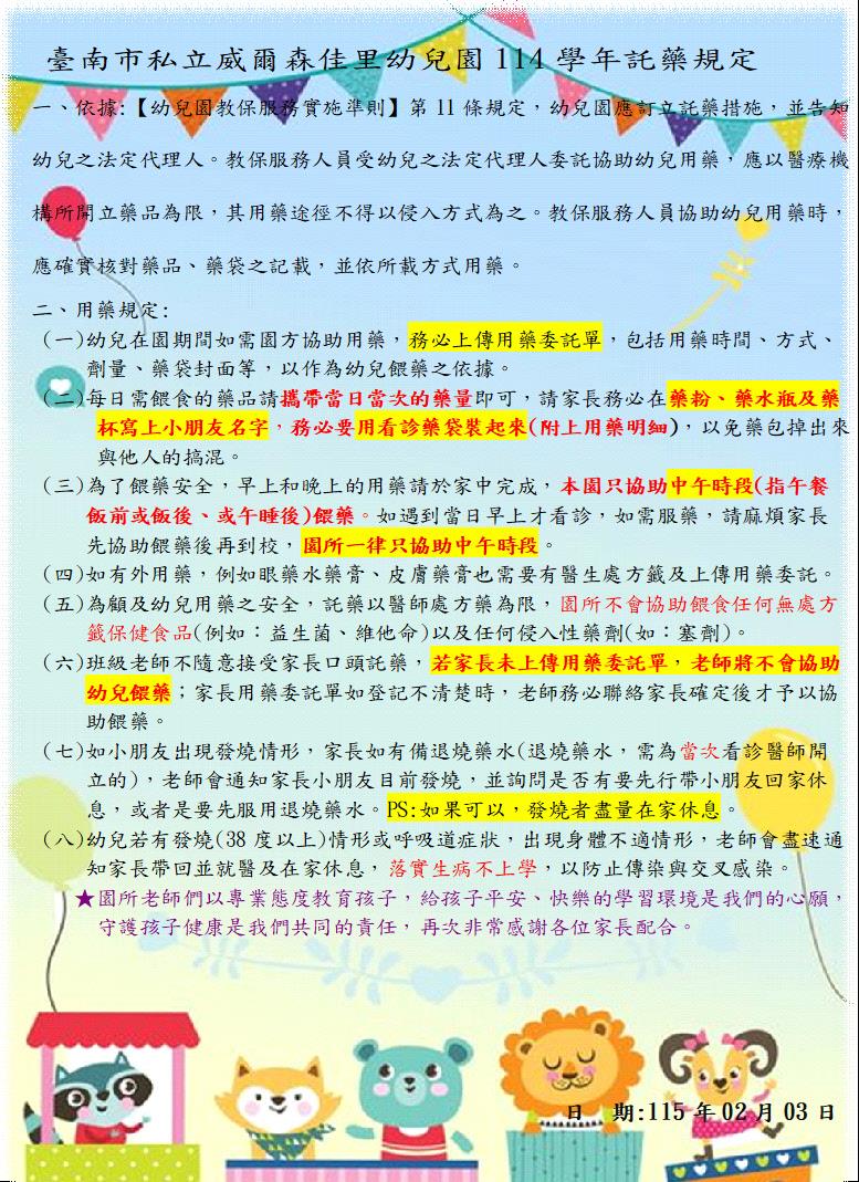 114學年下學期1150202-0213餐點表 食在健康 親愛的家長你(妳)好:園所公告的餐點表為暫定預告版,如想知道當日園所菜單,可上食材登錄平台,搜尋{臺南市佳里區臺南私立威爾森佳里幼兒園},謝謝!! 2026-01-29 李怡蒨 Read more