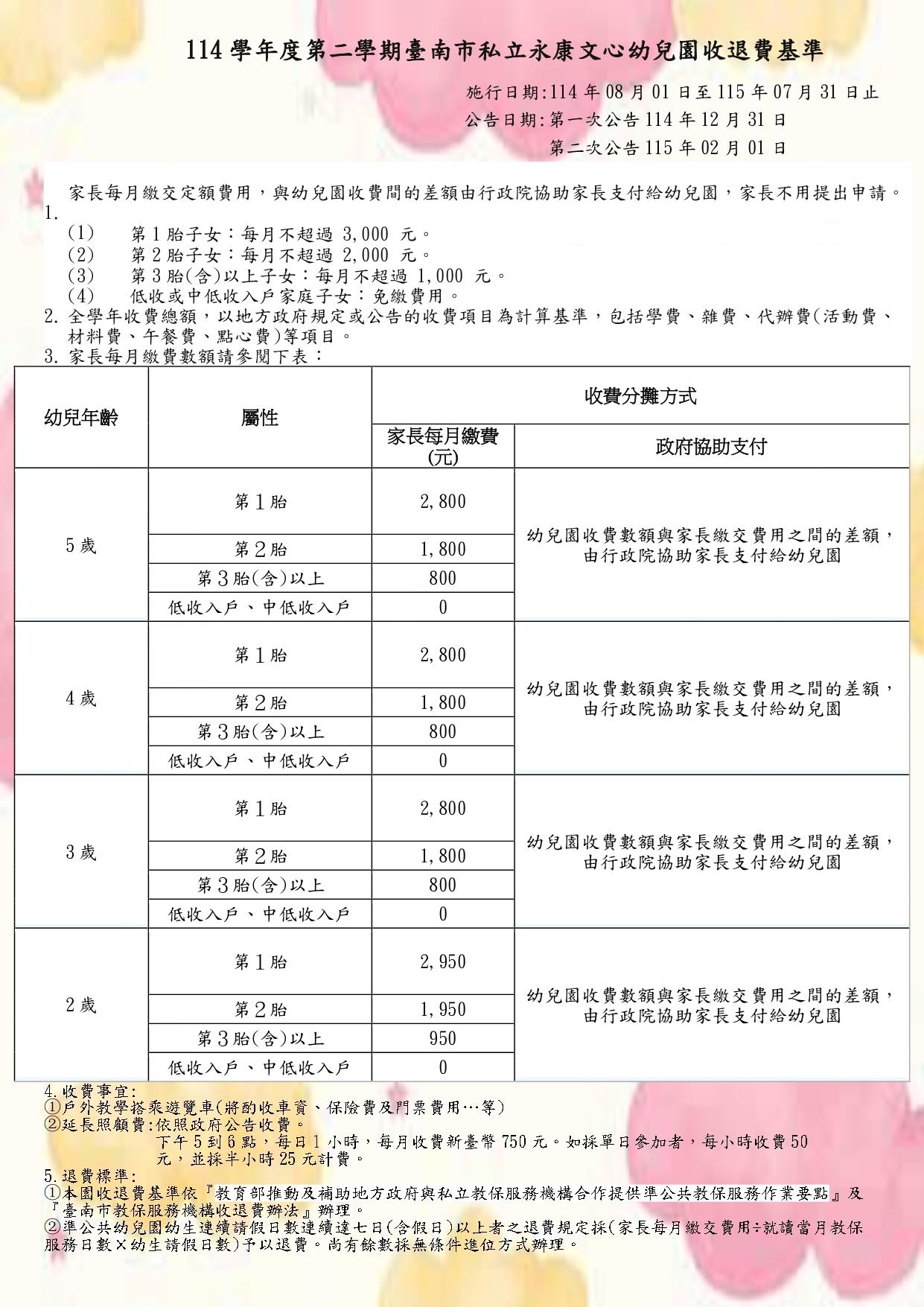 114學年收退費標準