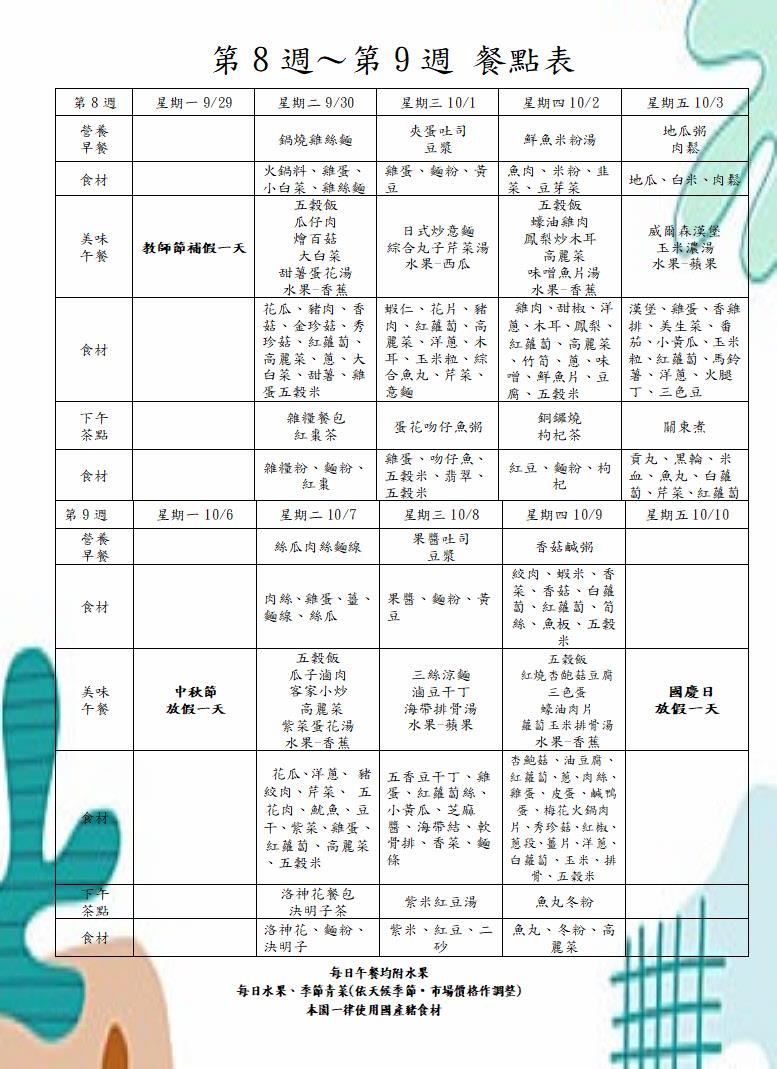 114學年度第一學期第八週-第九週餐點表