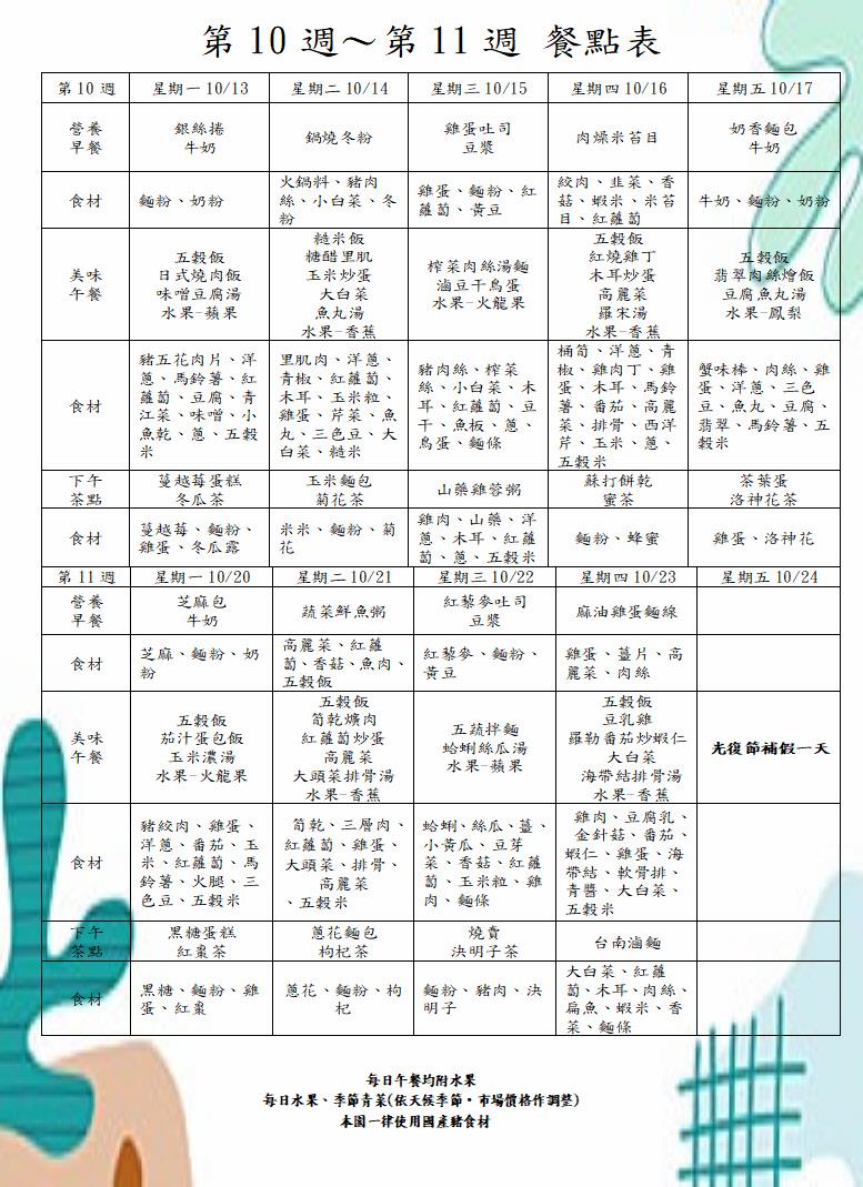 113學年度第一學期第十週-第十一週餐點表