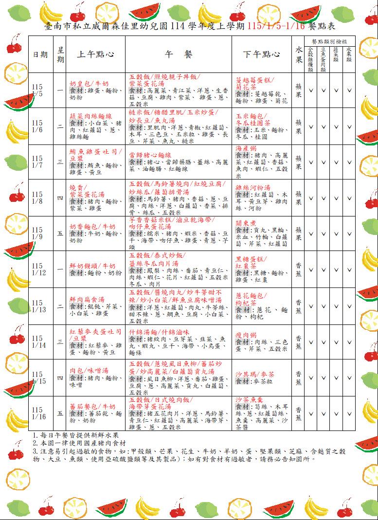 114學年上學期1124-1205餐點表 食在健康 親愛的家長你(妳)好:園所公告的餐點表為暫定預告版,如想知道當日園所菜單,可上食材登錄平台,搜尋{臺南市佳里區臺南私立威爾森佳里幼兒園},謝謝!! 2025-11-21 李怡蒨 Read more