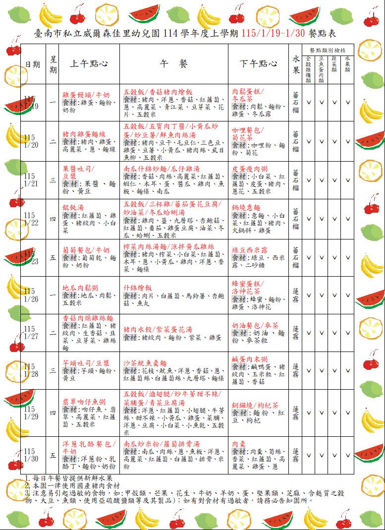 114學年上學期1150119-1150130餐點表 食在健康 親愛的家長你(妳)好:園所公告的餐點表為暫定預告版,如想知道當日園所菜單,可上食材登錄平台,搜尋{臺南市佳里區臺南私立威爾森佳里幼兒園},謝謝!! 2025-12-19 李怡蒨 Read more