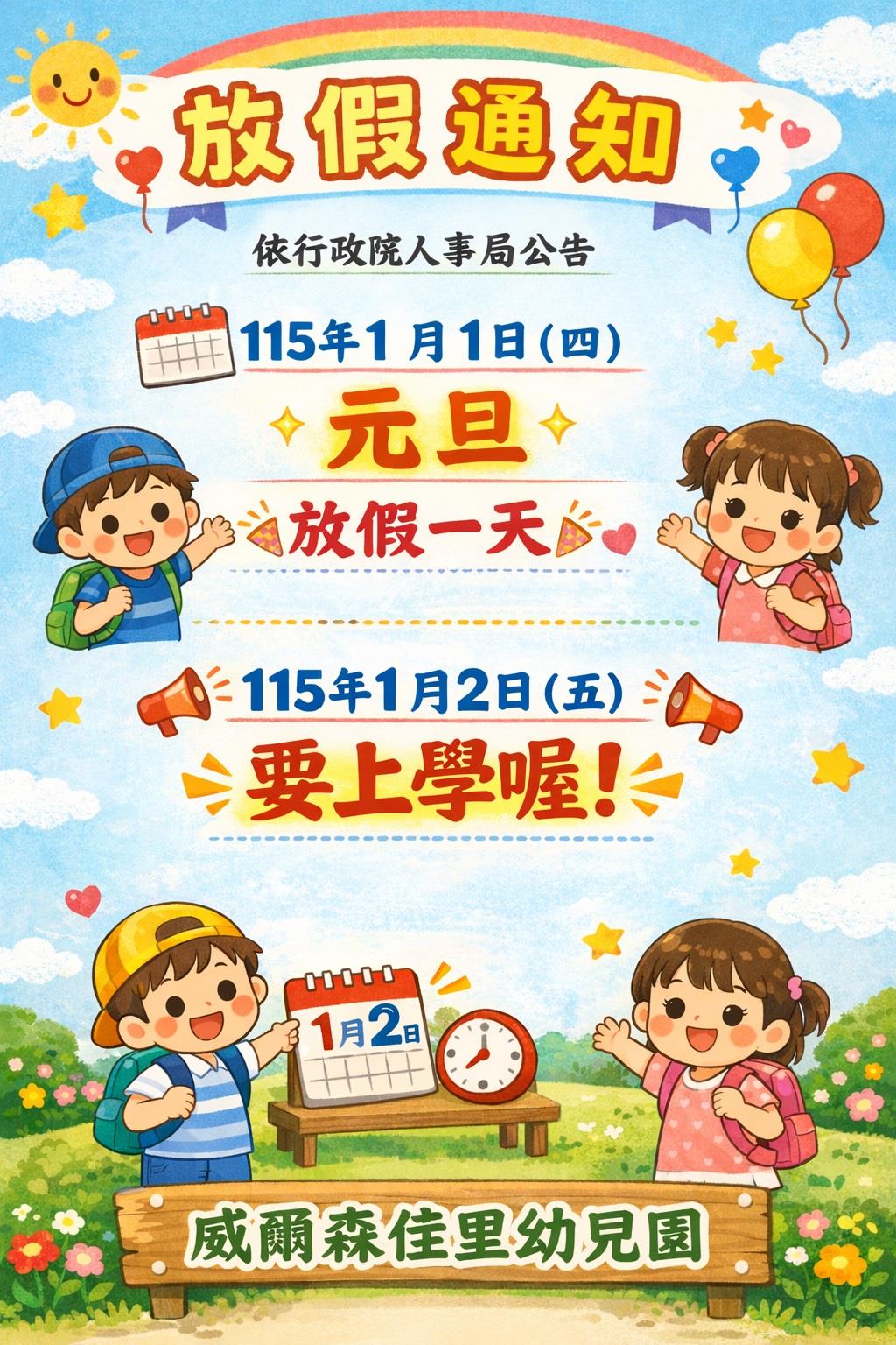 114學年上學期1222-1150102餐點表 食在健康 親愛的家長你(妳)好:園所公告的餐點表為暫定預告版,如想知道當日園所菜單,可上食材登錄平台,搜尋{臺南市佳里區臺南私立威爾森佳里幼兒園},謝謝!! 2025-12-19 李怡蒨 Read more