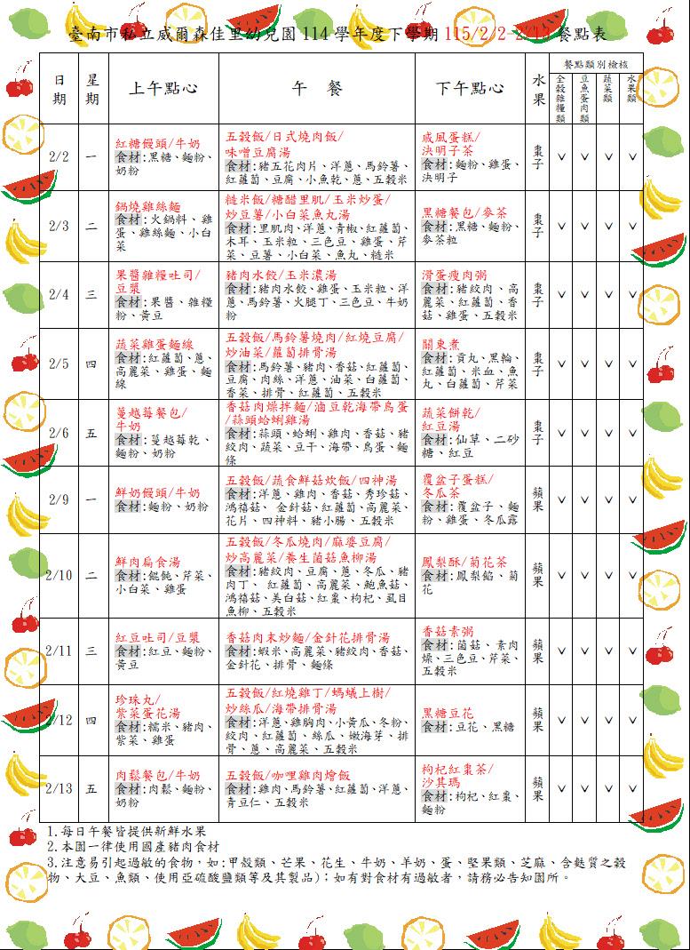 114學年下學期1150202-0213餐點表 食在健康 親愛的家長你(妳)好:園所公告的餐點表為暫定預告版,如想知道當日園所菜單,可上食材登錄平台,搜尋{臺南市佳里區臺南私立威爾森佳里幼兒園},謝謝!! 2026-01-29 李怡蒨 Read more